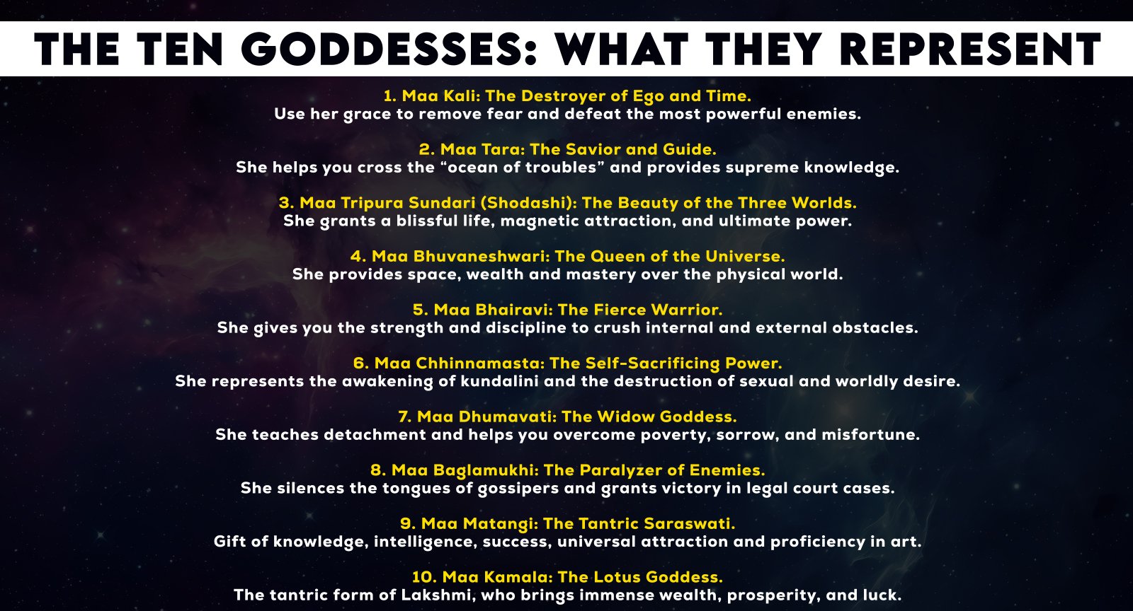 Inside, you will find a dedicated chapter for each Mahavidya, explaining her unique power: