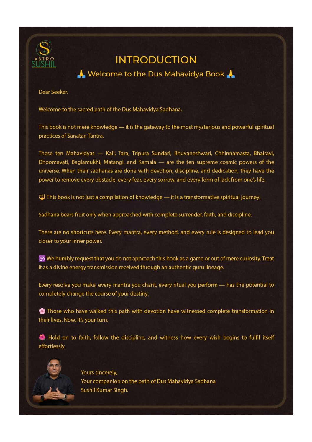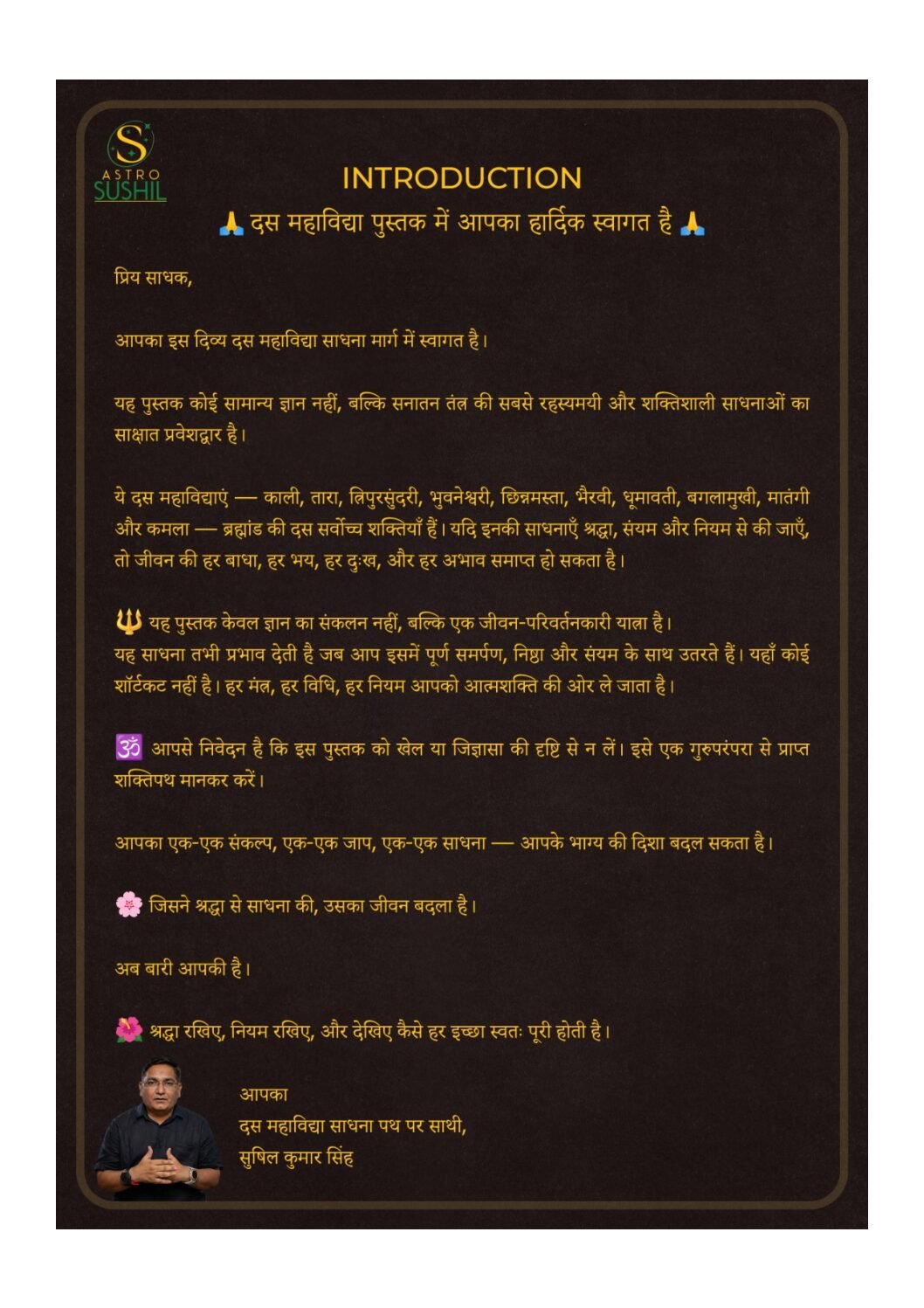 Astrosushil द्वारा लिखित यह मार्गदर्शिका अंग्रेजी और हिंदी दोनों भाषाओं में उपलब्ध है। यह दश महाविद्या की साधना पर आधारित एक व्यावहारिक मैनुअल है, जो साधकों को ‘सिद्धि’ प्राप्त करने के लिए एक सटीक “ब्लूप्रिंट” प्रदान करती है। यह पुस्तक केवल कहानियों का संग्रह नहीं है, बल्कि इसमें साधना की बारीकियों को समझाया गया है, जैसे रंगों का विज्ञान (किस देवी के लिए कौन सा रंग पहनें), पवित्र पुष्प अर्पण करने की विधि, और यंत्र साधना के गुप्त नियम। इसमें बीज मंत्रों के सटीक उच्चारण और लय के साथ–साथ पूर्ण अनुष्ठान विधि (बैठने की दिशा, समय और माला का चयन) का विस्तार से वर्णन किया गया है। यह पुस्तक उन लोगों के लिए अत्यंत लाभकारी है जो कानूनी बाधाओं, “ब्लैक मैजिक”, या शनि और राहु जैसे ग्रह दोषों से परेशान हैं। साथ ही, यह उन महत्वाकांक्षी पेशेवरों और गृहस्थों के लिए भी है जो अपने जीवन में शांति, समृद्धि और सफलता प्राप्त करना चाहते हैं।