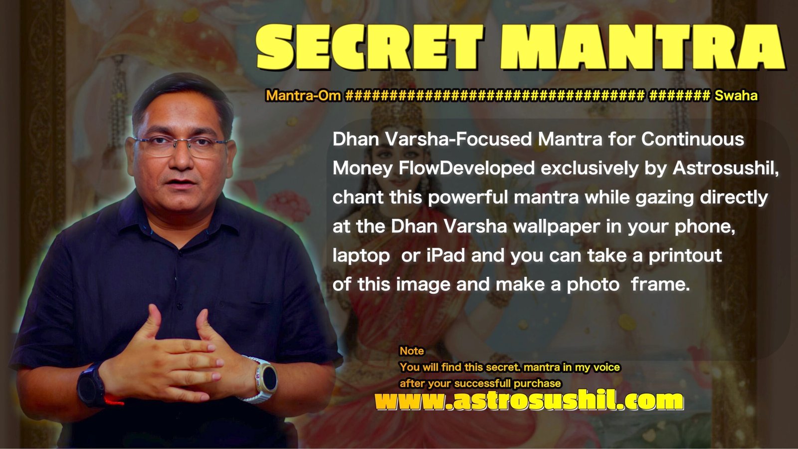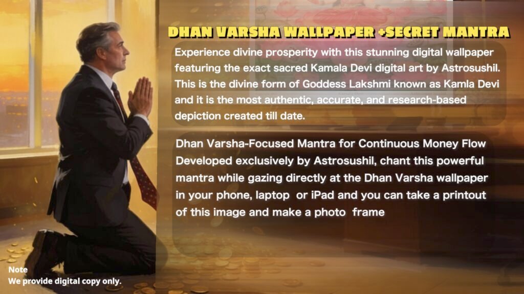Dhan Varsha Kit Invite continuous prosperity with the , featuring a powerful digital wallpaper of Goddess Kamala Devi (the Mahavidya form of Lakshmi) created by Astro Sushil after extensive research across 20+ ancient scriptures and global archives. This spiritually accurate artwork channels divine wealth energy into your home or workspace. Along with the wallpaper, you receive a secret Dhan Varsha mantra in Astro Sushil’s voice, which, when chanted daily while focusing on the image, activates positive vibrations for steady income, career growth, business success, and financial protection.